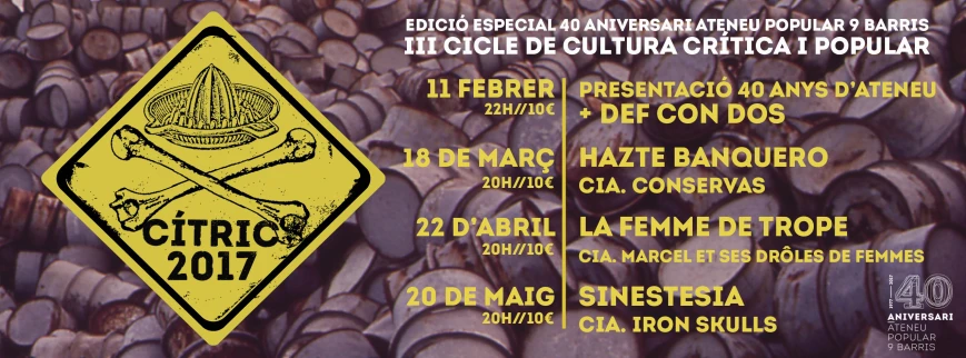 Arriba la tercera edició del Cítric i us proposem participar d'una gran celebració col·lectiva: el 40 aniversari de l'Ateneu. Hem preparat un Cítric molt especial, amb un recorregut multidisciplinari mensual que durant aquests pròxims 4 mesos ens permetrà gaudir d'espectacles d'un altíssim nivell artístic amb el component reivindicatiu, popular i crític que més ens agrada.