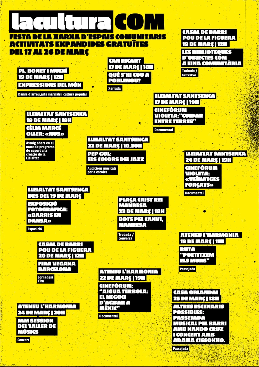 Ens fa molta il·lusió explicar-te en què consistirà aquesta festa, i perquè volem trobar-nos amb tu. LaculturaCOM és una gran trobada que del 17 al 26 de març farà parada a diversos espais com la Lleialtat Santsenca, Can Ricart, el Casal de Barri Pou de la Figuera, a la Pl. Crist Rei de Manresa, a l’Ateneu L’Harmonia i a la Casa Orlandai, aglutinant un conjunt d'activitats pensades per a diversos públics. I per rematar-ho, el 26 de març cabarem amb una gran festa conjunta a l’Ateneu Popular de 9 Barris.