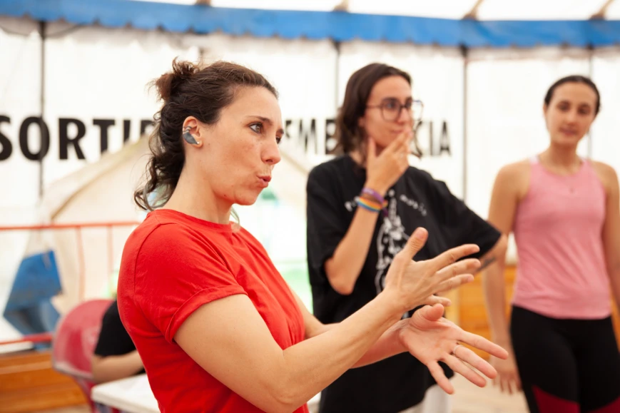 Una formadora de circ dona instruccions amb llengua de signes catalana en una sessió de pràctica de circ.