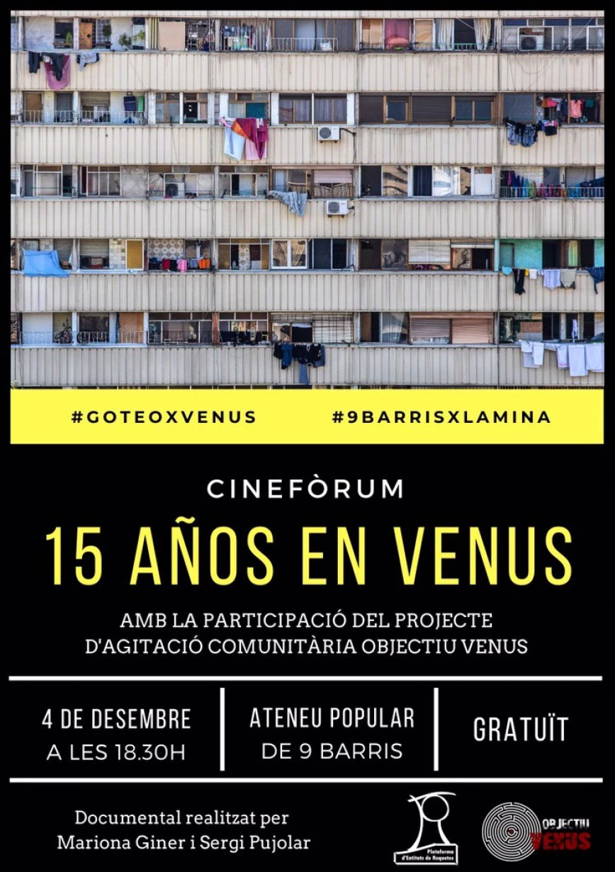 Dimecres agermanem la Mina i Nou Barris amb el passi del documental "15 anys a venus". Un documental que s'endinsa pels carrers del barri de la Mina de Barcelona, alhora que fa un recorregut des del seu origen, passant pels diferents plans de transformació, fins a la situació actual per a arribar, finalment, en el centre del conflicte: l'edifici Venus, paradigma de la greu problemàtica d'habitatge que arrossega el barri. Un film sense amabilitats ni sensacionalismes que dóna veu als habitants d'aquest immoble, alhora que informa amb tota serietat sobre la situació dramàtica d'una de les zones més conflictives de la ciutat.