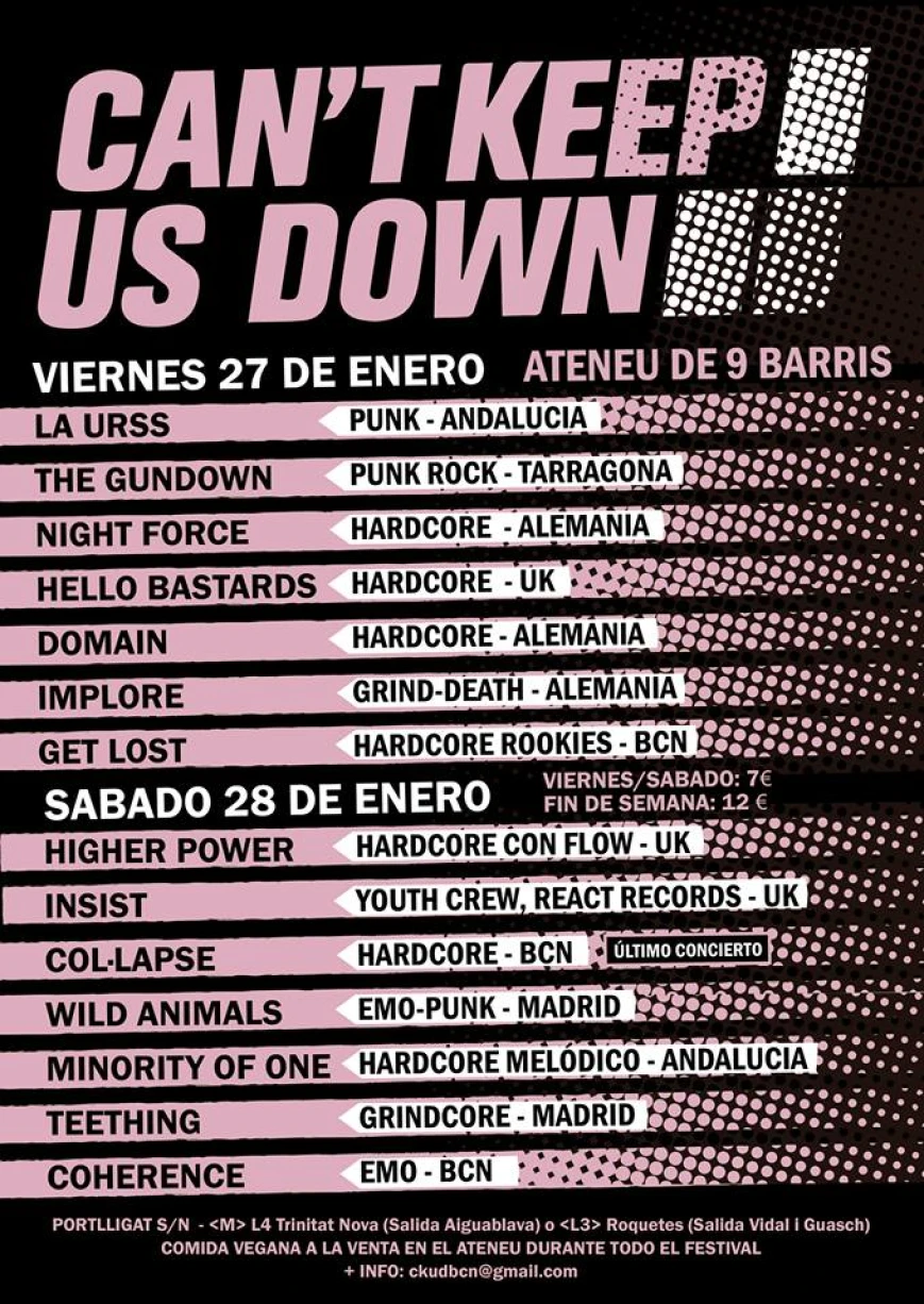 El divendres 27 i el dissabte 28 de gener es porta a terme un dels esdeveniments més importants del hardcore a la ciutat de Barcelona, Can't Keep Us Down. Durant dos dies grups nacionals i internacionals es donarant cita a l'Ateneu Popular 9 Barris.