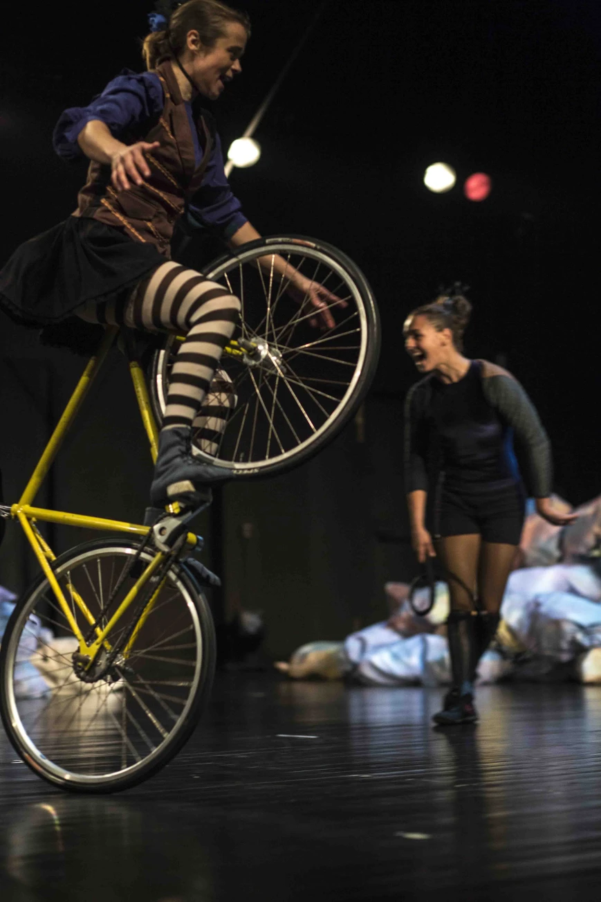 Diversió i poesia. Cinc dones, cinc països, molts idiomes. Rialles i més rialles. Una bicicleta, un pal, verticals, trapezi i pallasses i .... hòstia, un ós? Passar-ho bé, nosaltres, vosaltres, nens, adults i avis. Cap història. Només energia. Joc i més joc!