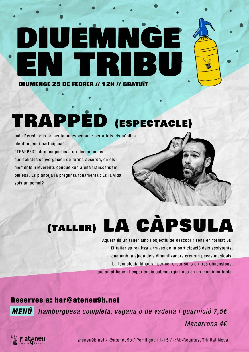 Inaugurem els diumenges en tribu, espectacle infantil, taller i dinar a preus populars en un ambient per a totes les edats i tipus de tribus, grups i famílies possible. Comptarem amb l’espectacle “Trapped” d’Inda Pereda i després de dinar amb un taller d’improvisació musical binaural a càrrec de La Càpsula. Cal reservar els dinars a: bar@ateneu9b.net