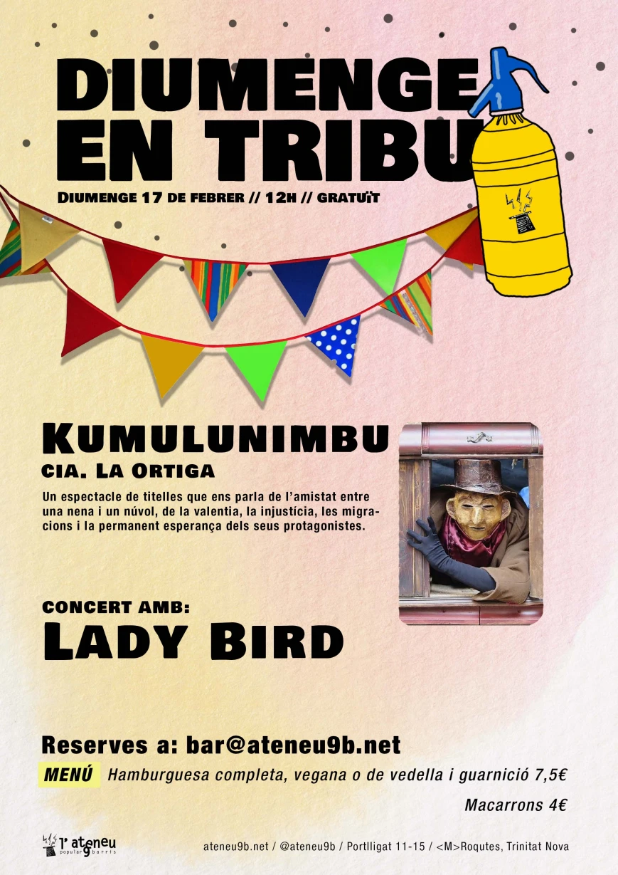 La cia. La Ortiga ens presenta l'espectacle Kumulunimbu, un espectacle de titelles que ens parla de l’amistat entre una nena i un núvol, de la valentia, la injustícia, les migracions i la permanent esperança dels seus protagonistes.