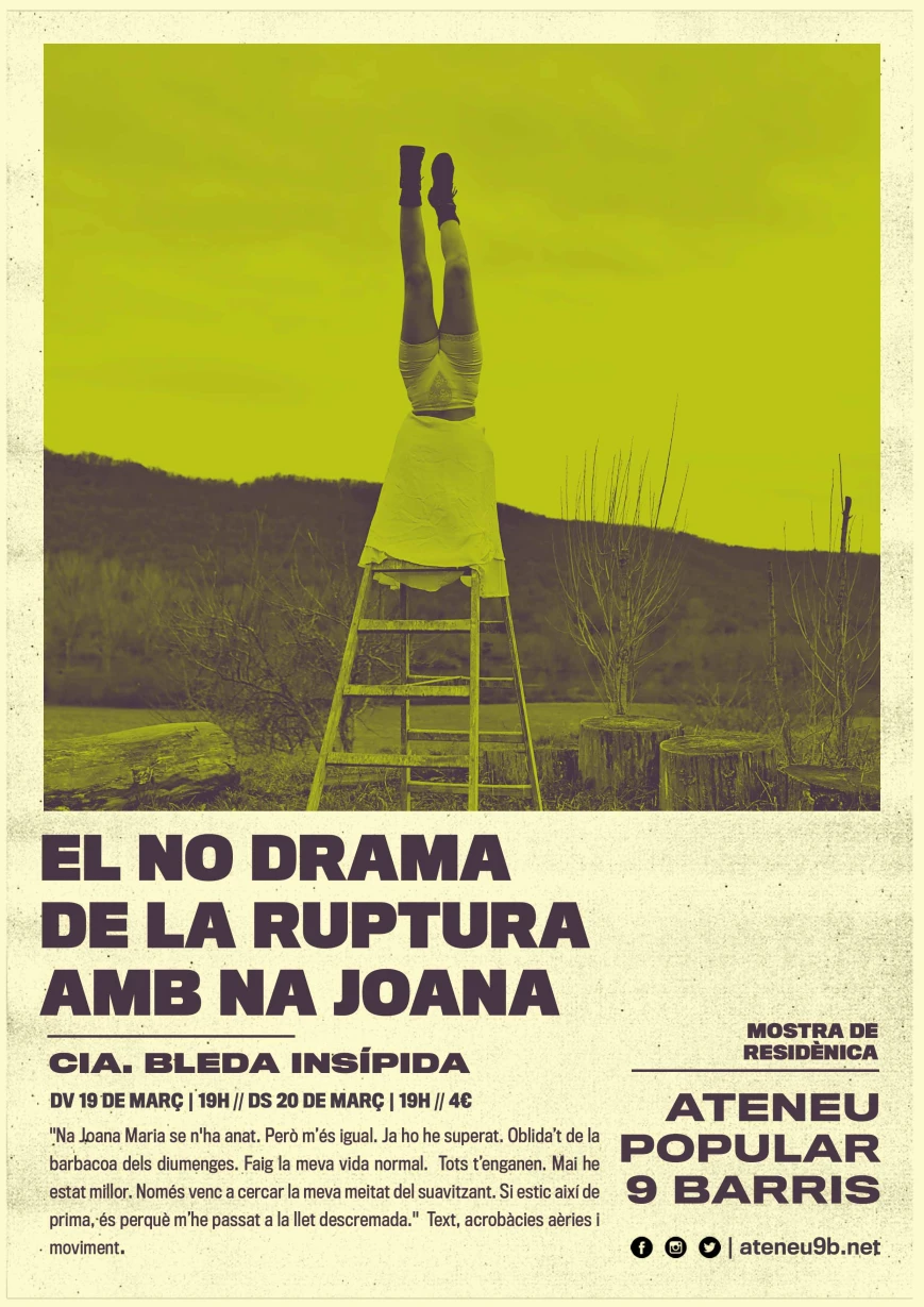 Després de dues setmanes de residència a l'Ateneu la companyia de circ Bleda Insípida ens presentarà, en format site specific i per duplicat l'espectacle El no drama de la ruptura amb na Joana. Des de l'Ateneu volem donar suport a la creació en circ a través de les nostres residències. Pots trobar més informació aquí.