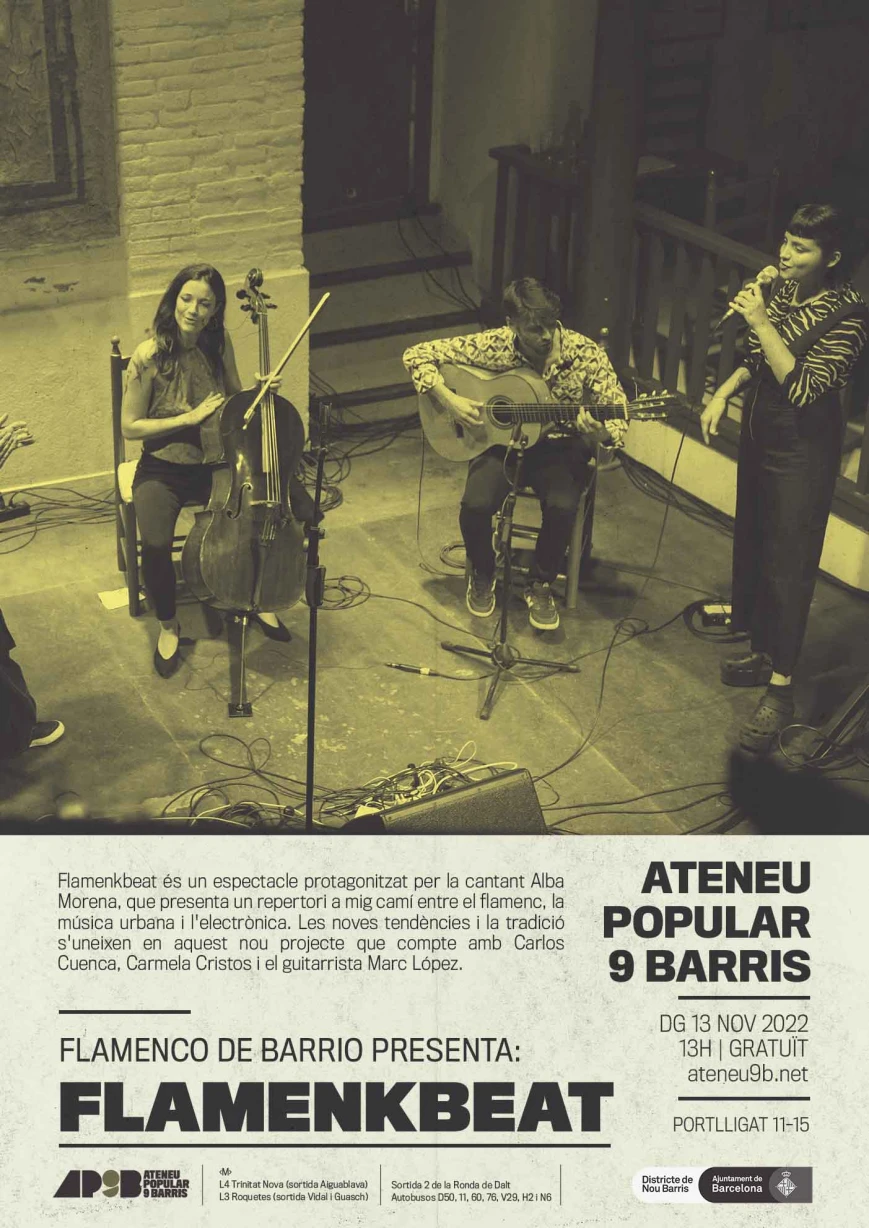Flamenkbeat és un espectacle protagonitzat per la cantant Alba Morena, que presenta un repertori a mig camí entre el flamenc, la música urbana i l'electrònica. Interpreta temes propis i temes tradicionals des d'una mirada moderna. Les noves tendències i la tradició s'uneixen en aquest nou projecte que compte amb la producció musical de Carlos Cuenca, encarregat de la música electrònica en el directe. També pujaran a l'escenari la cantaora Cristina López, la chelista Carmela Cristos i el guitarrista Marc López.