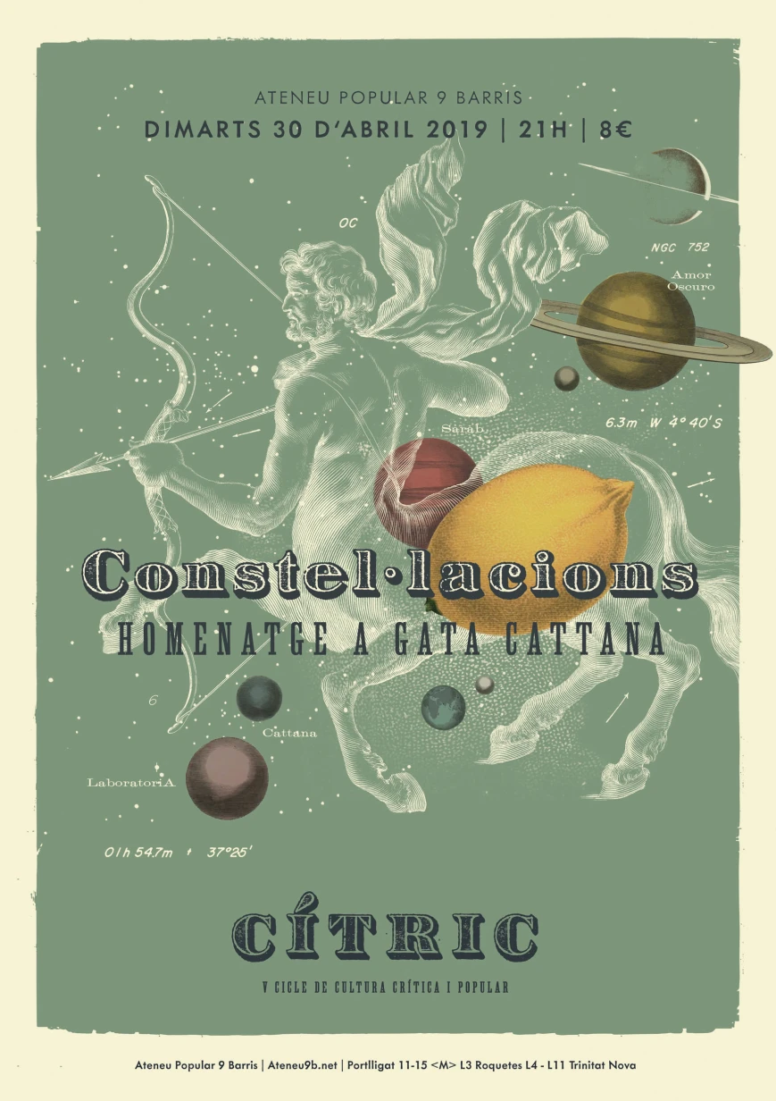 Acompanyats del col·lectiu cultural Quattrocento presentem "Constelaciones": un homenatge a Gata Cattana. Poetessa, rapera, i politòloga va influenciar tota una generació a través d'un missatge feminista i compromès barrejat amb un estil urbà sense complexos. Banzai, el seu disc pòstum, recopila milions de visualitzacions a les plataformes d'streaming.
