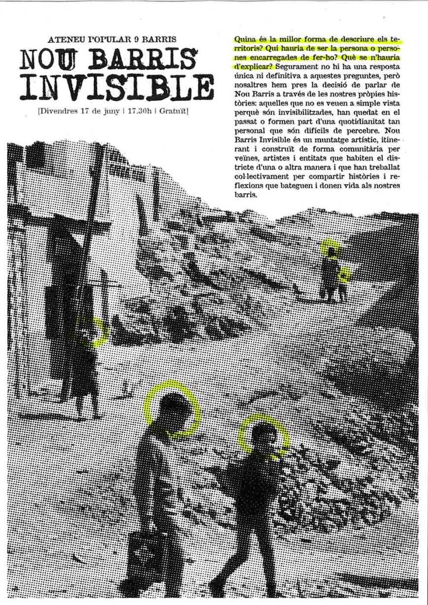Nou Barris Invisible és un muntatge artístic, itinerant i construït de forma comunitària per veïnes, artistes i entitats que habiten el districte d’una o altra manera i que han treballat col·lectivament per compartir històries i reflexions que bateguen i donen vida als nostres barris.