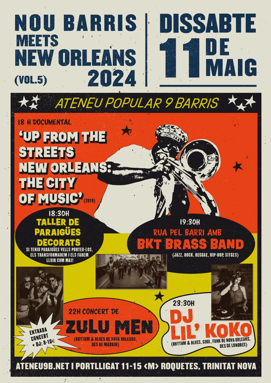 Com és tradició a Nova Orleans, portarem la música pels carrers i les places, fent un recorregut per diversos barris del districte. Ens hi acompanyes?. Aquest any comptarem amb la BKT BRASS BAND. Una brass band formada per joves de Sitges que partint de l’ADN de New Orleans ens presentaran una proposta musical fresca i dinàmica que no renuncia a introduir elements d’altres estils com el Rock, Reggae o el Hip-Hop, ni a la improvisació individual dels diversos solistes del grup. Ball i diversió assegurada...