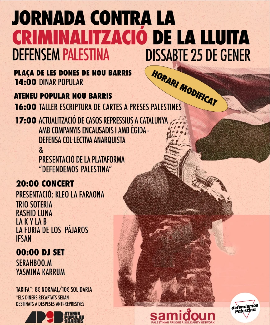 Aquest 25 de gener, tindrem una actualització dels casos repressius a Catalunya amb companys/es encausades i amb Defensa Col·lectiva Anarquista. També hi haurà una presentació de la plataforma Defensem Palestina i un taller d’escriptura de cartes a preses palestines, a més d’un dinar popular, concerts i discjòqueis.