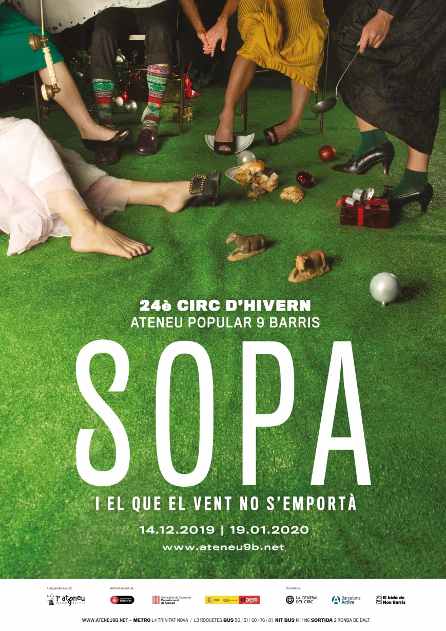 “Sopa i el que el vent no s’emportà” és un espectacle de circ que explora amb humor i tragèdia un seguit de dinars de Nadal d’una mateixa família a través de diverses generacions: la tradició, els hàbits, l’absència, la vida que passa i els records que defineixen qui som. Any rere any a la mateixa taula, sota la mateixa finestra, la mateixa recepta, el mateix avet, les mateixes cançons i el vent a fora. Al ritme dels hiverns, en el temps d’un àpat, ens podem reconèixer dins d’aquesta estranya família.