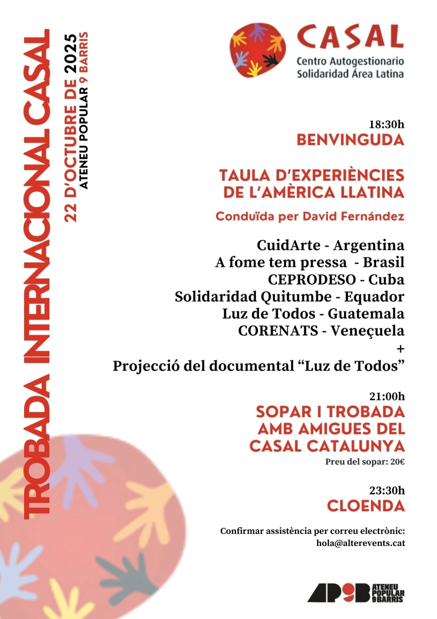 L’Ateneu Popular 9 Barris acull aquest 22 d’octubre de 2025 la Trobada Internacional Casal, una jornada organitzada pel Centro Autogestionario Solidaridad Área Latina (CASAL) per compartir experiències i teixir vincles entre projectes d’arreu de l’Amèrica Llatina i Catalunya.